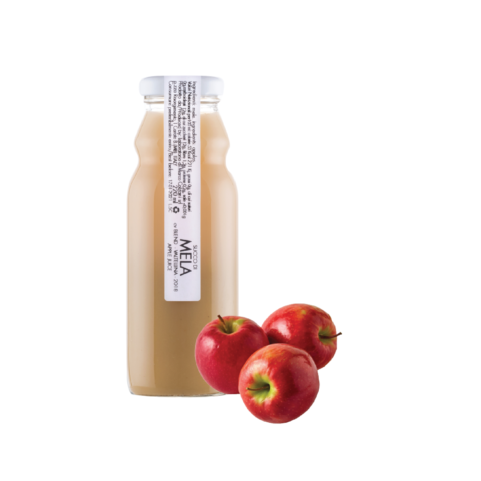 This is an apple juice made only from apples grown by local farmers and picked at the right level of ripeness, and nothing more. It does not contain any sugars other than apple sugar. For this sugar-free apple juice, Marco Colzani usually chooses mountain apples from Valtellina, but if at the time of selection they are not of the desired quality, they are replaced by other Italian apples. It is made according to the Marco Colzani method, which in all its products adheres to a careful selection of quality raw materials and the exclusion of everything unnecessary.