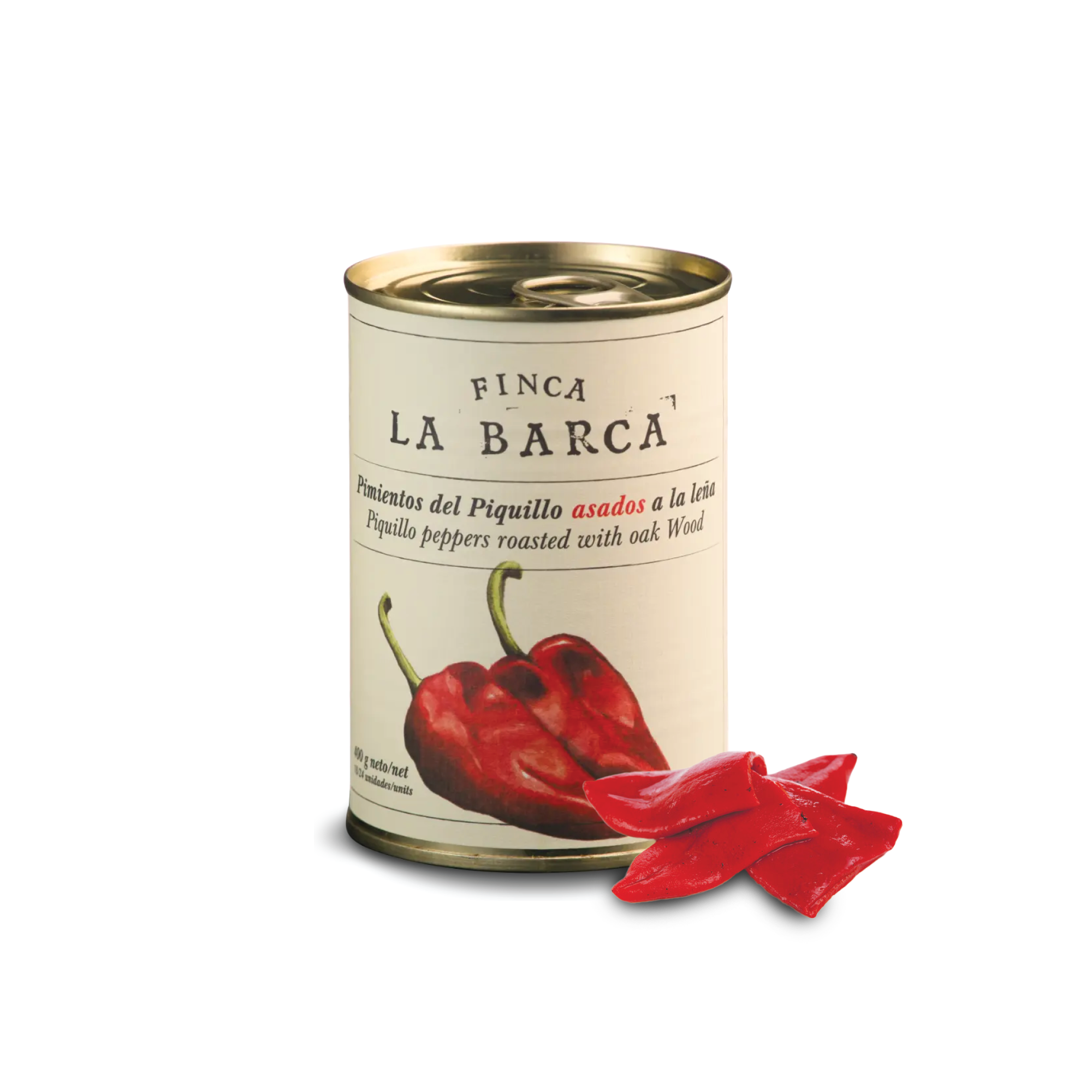 The Wood-fired Roasted Piquillo Peppers 400g Finca La Barca peppers are a true representation of the culinary tradition of the La Vera region. Each pepper is hand-selected with great care, ensuring that only the best specimens are used in this artisanal process. Slowly roasted in the traditional style, these peppers acquire a unique sweet and smoky flavour, which makes them unmistakable. After the roasting process, they are peeled by hand, maintaining their integrity, texture and authentic flavour.